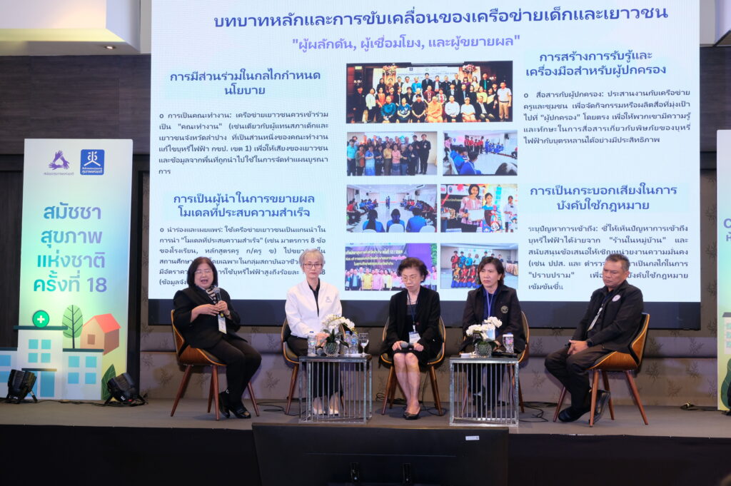เวทีเสวนาย่อยหัวข้อ “ภาคประชาสังคมจะมีส่วนร่วมและหนุนเสริมในการปกป้องเด็กและเยาวชนจากบุหรี่ไฟฟ้าในพื้นที่ได้อย่างไร” ในกิจกรรมตลาดนัดนโยบายภายในงานสมัชชาสุขภาพแห่งชาติ ครั้งที่ 18 พ.ศ. 2568 ซึ่งจัดขึ้นโดยสำนักงานคณะกรรมการสุขภาพแห่งชาติ (สช.) ร่วมกับภาคีเครือข่ายยุทธศาสตร์ เมื่อวันที่ 28 พ.ย. 2568 ณ อาคารอิมแพ็ค ฟอรั่ม เมืองทองธานี ได้มีการนำเสนอและแลกเปลี่ยนแนวทางการแก้ไขปัญหาบุหรี่ไฟฟ้าในเด็กและเยาวชนในระดับพื้นแบบบูรณาการ ผ่านกลไกคณะกรรมการเขตสุขภาพเพื่อประชาชน (กขป.) 4 เขตพื้นที่