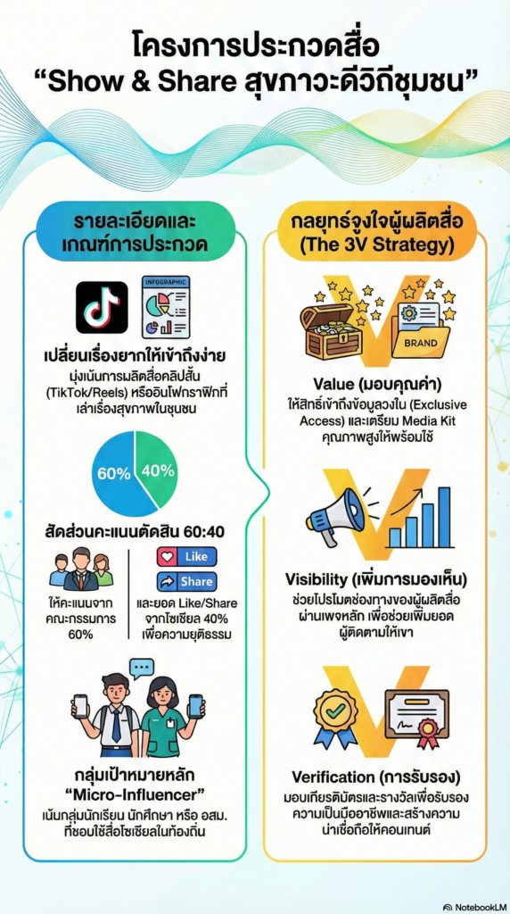 เพื่อต่อยอดจากแผนงานออนไลน์ สช. กำหนดจัดประชุมเชิงปฏิบัติการ On-site ในวันที่ 23-24 กุมภาพันธ์ 2569 ณ โรงแรมเบสท์เวสเทิร์น จตุจักร เพื่อระดมสมองเครือข่ายสื่อจากทั้ง 13 เขตทั่วประเทศ ในการขับเคลื่อนแคมเปญ “Show & Share สุขภาวะดีวิถีชุมชน” ซึ่งจะเปิดโอกาสให้นักเรียน นักศึกษา อสม. และ Micro-Influencer ร่วมส่งผลงานสื่อสร้างสรรค์ ทั้งในรูปแบบคลิปสั้น (Short Video), Infographic และ Photo Essay