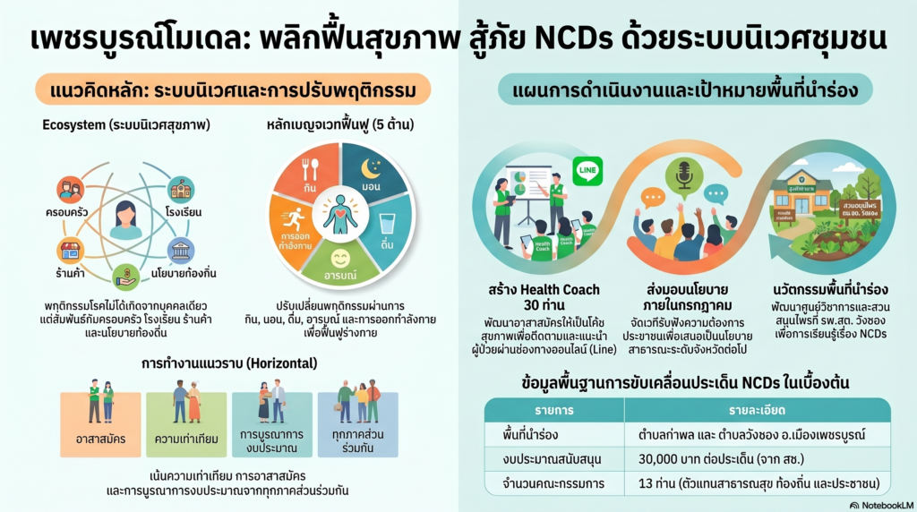• การพัฒนาตำบลต้นแบบ: กำหนดให้ ตำบลท่าพล อำเภอเมือง จังหวัดเพชรบูรณ์ เป็นพื้นที่นำร่องในการขับเคลื่อนเชิงนโยบายและพื้นที่รูปธรรม เพื่อสร้างระบบนิเวศสุขภาพ (Ecosystem) ที่เอื้อต่อการปรับเปลี่ยนพฤติกรรมสุขภาพ