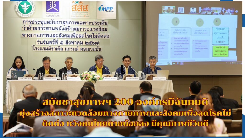 เมื่อวันที่ 5 ส.ค. 2567 สำนักงานคณะกรรมการสุขภาพแห่งชาติ (สช.) พร้อมด้วย กระทรวงสาธารณสุข (สธ.) โดยกรมควบคุมโรค สำนักงานกองทุนสนับสนุนการสร้างเสริมสุขภาพ (สสส.) สำนักงานพัฒนานโยบายสุขภาพระหว่างประเทศ (IHPP) และภาคีเครือข่าย ร่วมกันจัดเวที สมัชชาสุขภาพเฉพาะประเด็น ว่าด้วยการสานพลังสร้างสภาวะแวดล้อมทางกายภาพและสังคมเพื่อลดโรคไม่ติดต่อ มีตัวแทนภาคีองค์กรกว่า 200 ราย เข้าร่วมประชุมผ่านช่องทาง Onsite และ Online ได้ร่วมกันรับรองมติสมัชชาสุขภาพเฉพาะประเด็นดังกล่าวอย่างเป็นฉันทมติ พร้อมกล่าวถ้อยแถลงเพื่อสนับสนุนการขับเคลื่อนนโยบายสาธารณะในประเด็นดังกล่าวด้วยกัน