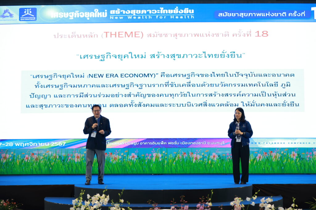 วันสุดท้ายของงานสมัชชาสุขภาพแห่งชาติ ครั้งที่ 17 พ.ศ. 2567 ซึ่งสำนักงานคณะกรรมการสุขภาพแห่งชาติ (สช.) ร่วมกับภาคีเครือข่ายยุทธศาสตร์ จัดขึ้นระหว่างวันที่ 27-28 พ.ย. 2567 ณ อาคารอิมแพ็ค ฟอรั่ม เมืองทองธานี ภายใต้ประเด็นหลัก “เศรษฐกิจยุคใหม่ สร้างสุขภาวะไทยยั่งยืน” ยังคงเป็นไปอย่างคึกคัก โดยที่ประชุมซึ่งมีผู้เข้าร่วมทั้ง onsite และผ่านระบบ online รวมกว่า 3,000 คน ได้ร่วมกันให้การรับรองระเบียบวาระสมัชชาสุขภาพแห่งชาติ ครั้งที่ 17 จำนวน 2 มติ อย่างเป็นฉันทมติ คือไม่มีผู้คัดค้านแม้แต่รายเดียว